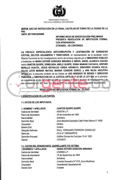 “En mérito a lo afirmado y con las facultades conferidas por el artículo 302 del Código de Procedimiento Penal, el suscrito fiscal de materia impetra la aplicación de la extrema medida de detención preventiva en el centro penitenciario de San Pedro al imputado Santos Quispe Quispe conforme al artículo 233 del Código de Procedimiento Penal por el lapso de tres meses”, dice en la parte de la resolución de imputación firmada firmada por ambos representantes del ministerio Público.