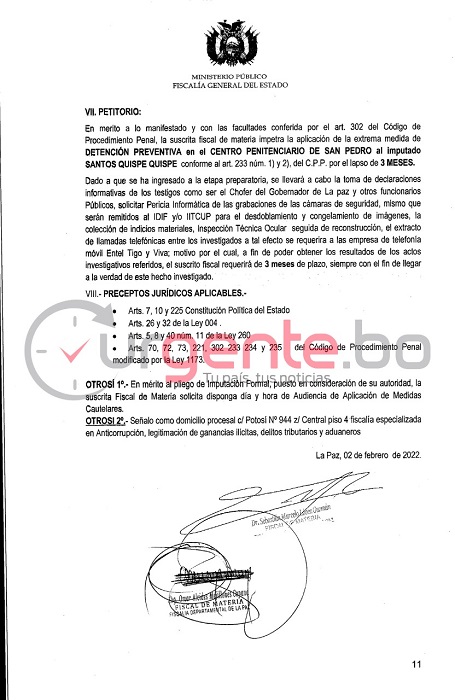 En un requerimiento suscrito la tarde de este miércoles, los fiscales de materia Omar Alcides Mejillones y Sebastián Lopez Guzmán solicitó la detención preventiva de tres meses contra el gobernador del departamento de La Paz, Santos Quispe, por el consumo de bebidas alcohólicas en el despacho del inmueble ubicado en el kilómetro cero.
