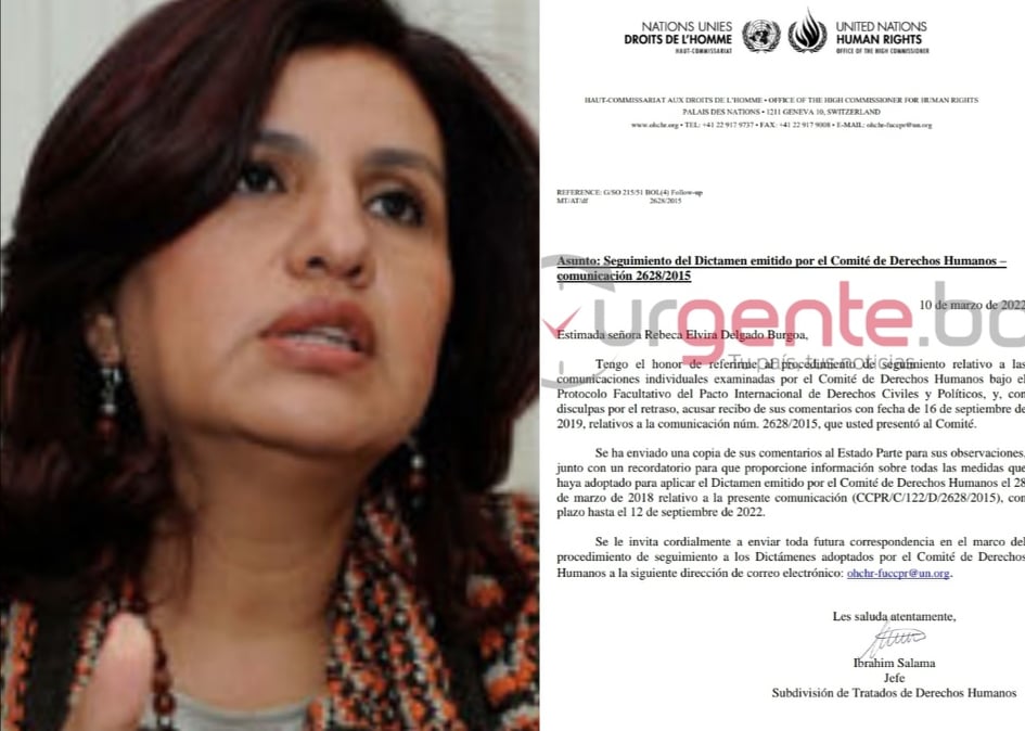 21 de marzo (Urgente.bo).- El Comité de Derechos Humanos del Pacto Internacional de Derechos Civiles y Políticos de la Organización de Naciones Unidas (ONU), pide al Gobierno boliviano que proporcione información sobre las medidas que adoptó del dictamen emitido el 2018, que pedía un resarcimiento económico por violación a los derechos políticos y cívicos de la excandidata a la alcaldía por Cochabamba, Rebeca Delgado.