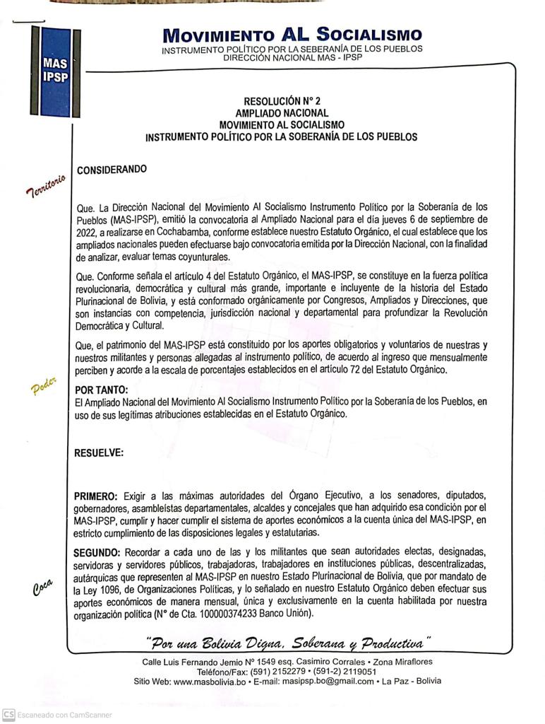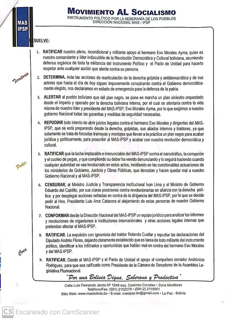 “Censurar al ministro de Justicia y Transparencia Institucional, Iván Lima, y al ministro de Gobierno, Eduardo Del Castillo, por sus claras posiciones contra revolucionarias en alianza con la derecha política y por desplegar acciones nefastas en contra la dirigencia del MAS por lo que se le pide al hermano Luis Arce Catacora el alejamiento de estas personas de nuestro Gobierno nacional”, señala el punto seis de la resolución.
