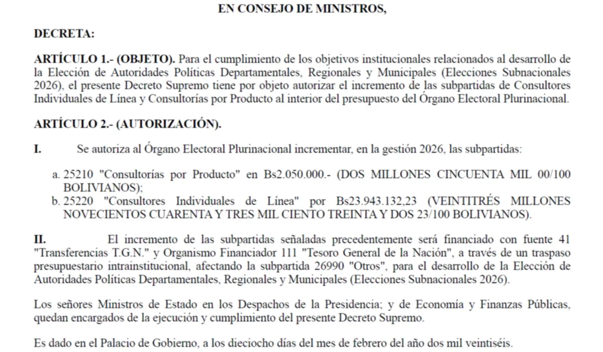 La norma, emitida en la víspera y publicada en la Gaceta Oficial de Bolivia, establece la ampliación de recursos en dos subpartidas específicas: Bs 2.050.000 para “Consultorías por Producto” y Bs 23.943.132,23 para “Consultores Individuales de Línea”.