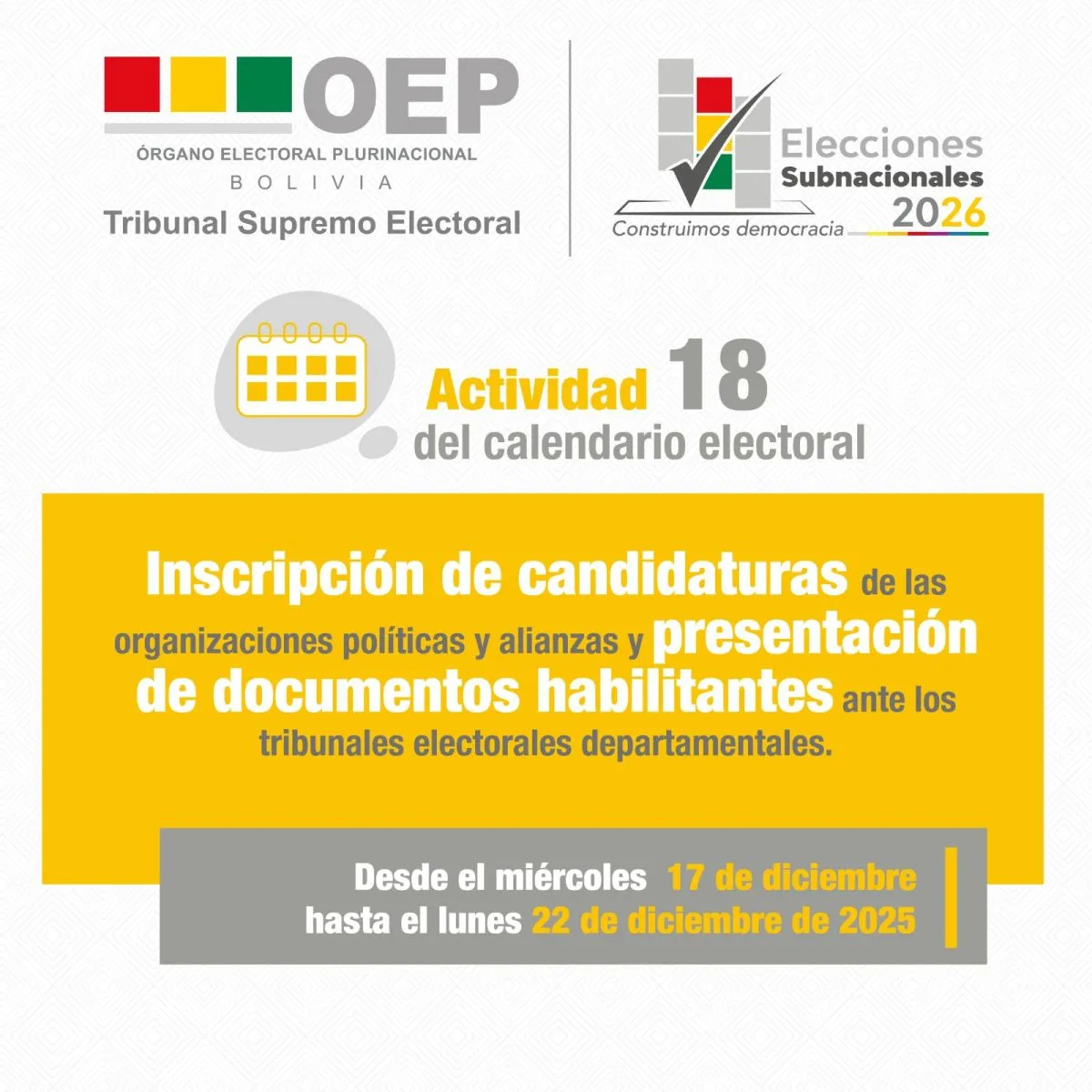 “En cumplimiento de la actividad N.° 18 del calendario electoral, el Tribunal Supremo Electoral informa que la inscripción de candidaturas de las organizaciones políticas y alianzas, y la presentación de documentos habilitantes ante los tribunales electorales departamentales, se llevará a cabo desde el miércoles 17 de diciembre y se extenderá hasta el lunes 22 de diciembre”, indica el Órgano Electoral en un comunicado.