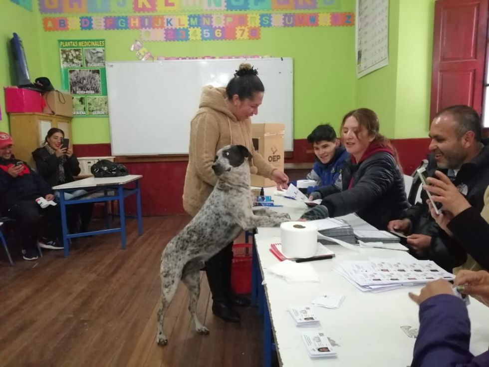 Rodrigo es un perro comunitario; es decir, no vive con una familia en específico sino con más de una. Generalmente se lo ve por el Arco de Cobija. Este domingo, cuando una vecina fue a votar a la mesa número 1 del Santa Rosa, el can la acompañó y, mientras ella firmaba, Rodrigo puso las patas en la mesa. Fue cuando funcionaron las cámaras… y las bromas.
