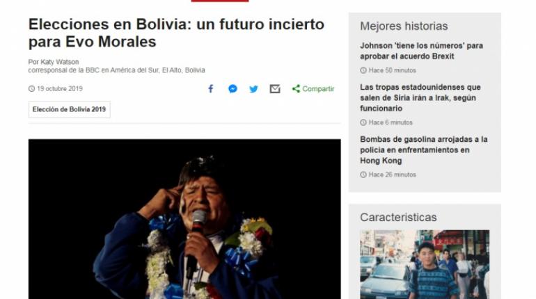 Muchos de los medios internacionales enfocan su información en la repostulación del presidente Evo Morales, preocupación de los ciudadanos a la hora de votar e incluso sobre el miedo al fraude electoral que existe en los bolivianos. Mira algunas noticias de medios internacionales que hablan de la jornada electoral en Bolivia: