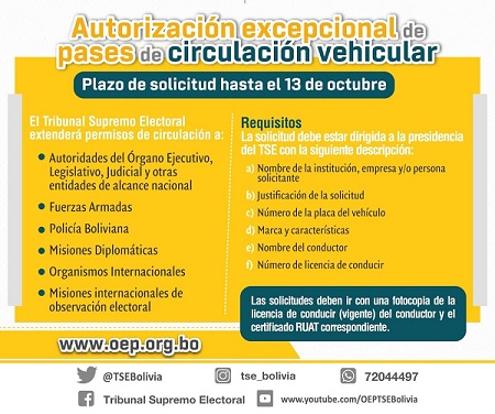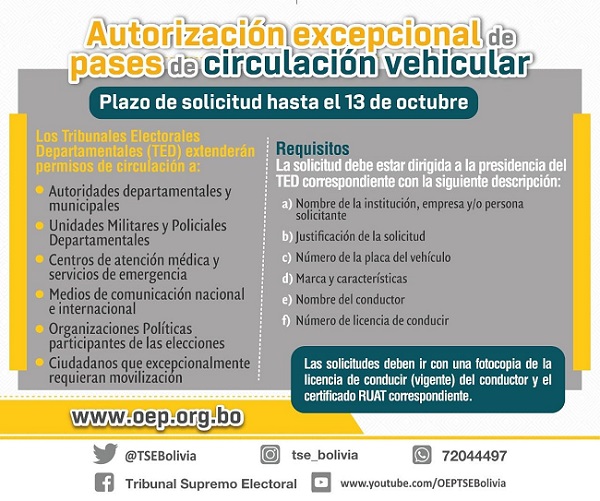 El Tribunal Supremo Electoral (TSE) y los Tribunales Electorales Departamentales (TED) recibirán solicitudes de autorización de circulación vehicular para la jornada de votación del 18 de octubre de 2020, de manera física hasta las 15:00 y de forma virtual hasta las 23:59 del 13 de octubre de 2020.