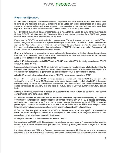 La respuesta del Gerente General de Neotec es la siguiente: “El lunes 21 de octubre a las 14:30 se otorga acceso a Internet a oficinas de SERECI y se reanuda la verificación de actas. A horas 18:29 se reasume la generación de resultados. Entre las 20:10 de la noche de la elección y las 18:29 del día siguiente se verifican 3,833 adicionales, lo cual provoca una diferencia en los porcentajes de votación, con una caída de 1.12% para el CC y un aumento de 1.16% para el MAS”