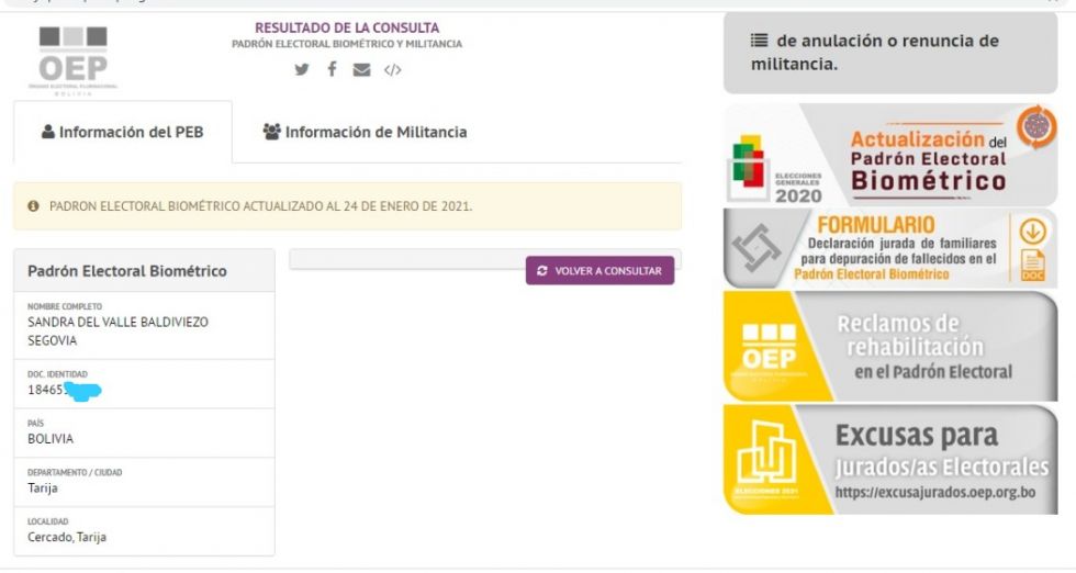 La información se hizo llegar a este medio de comunicación con salvaguarda de fuente, y la misma fue verificada en la plataforma pública del OEP.