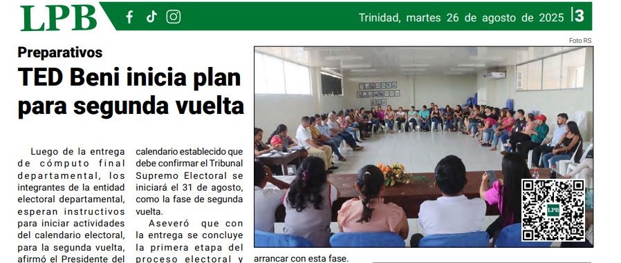 Luego de la entrega de cómputo final departamental, los integrantes de la entidad electoral departamental, esperan instructivos para iniciar actividades del calendario electoral, para la segunda vuelta, afirmó el Presidente del TED Beni,Rubéns Darío Quinteros Salas.