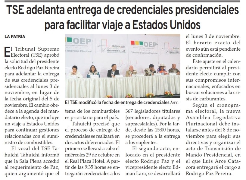 EI Tribunal Supremo Electoral (TSE) aprobó la solicitud del presidente electo Rodrigo Paz Pereira para adelantar Ia entrega de sus credenciales presidenciales al lunes 3 de noviembre, en lugar de la fecha original del 5 de noviembre. EI cambio obedece a Ia agenda del mandatario electo, que incluye un viaje a Estados Unidos para continuar gestiones relacionadas con el suministro de combustibles.