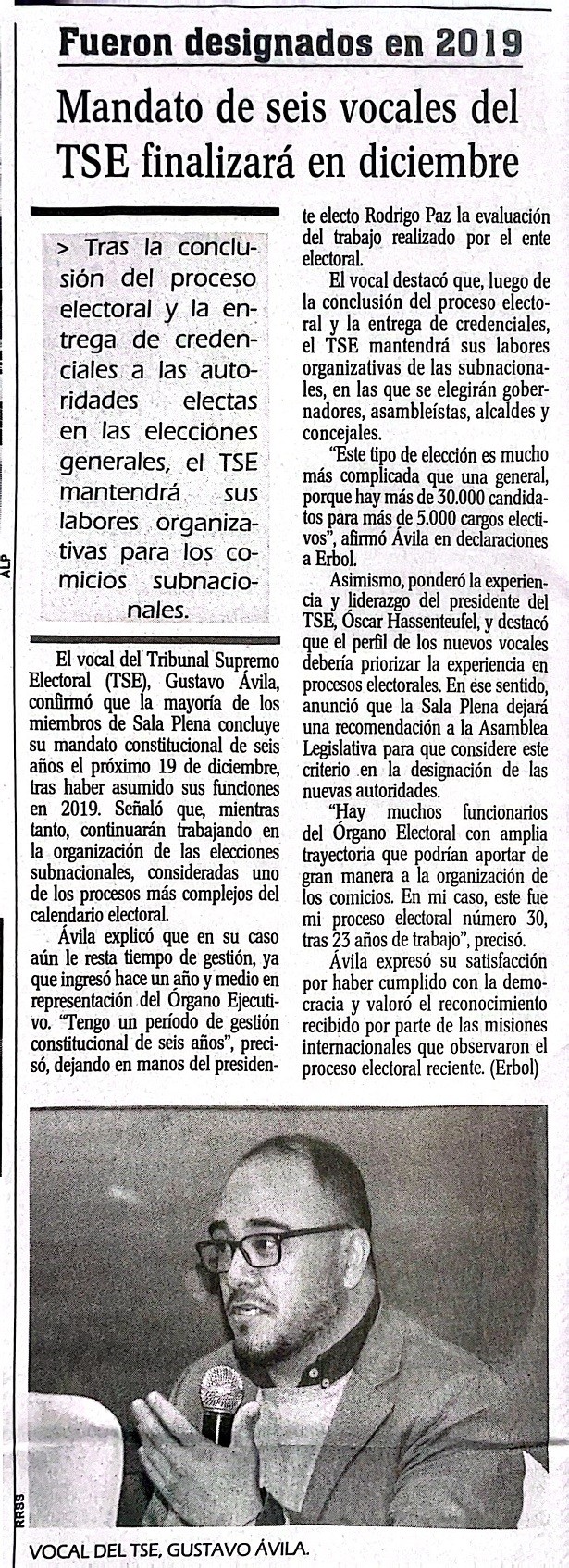 El vocal del Tribunal Supremo Electoral (TSE), Gustavo Ávila, confirmó que la mayoría de los miembros de Sala Plena concluye su mandato constitucional de seis años el próximo 19 de diciembre, tras haber asumido sus funciones en 2019. Señaló que, mientras tanto, continuarán trabajando en la organización de las elecciones subnacionales, consideradas uno de los procesos más complejos del calendario electoral.