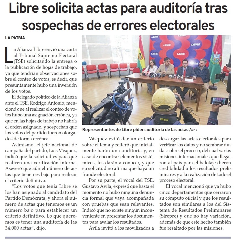 (TSE) solicitando la entrega o Ia publicación de hojas de trabajo, ya que tendrían observaciones sobre el conteo de votos, es decir, que presuntamente hubo una inversión de los votos.