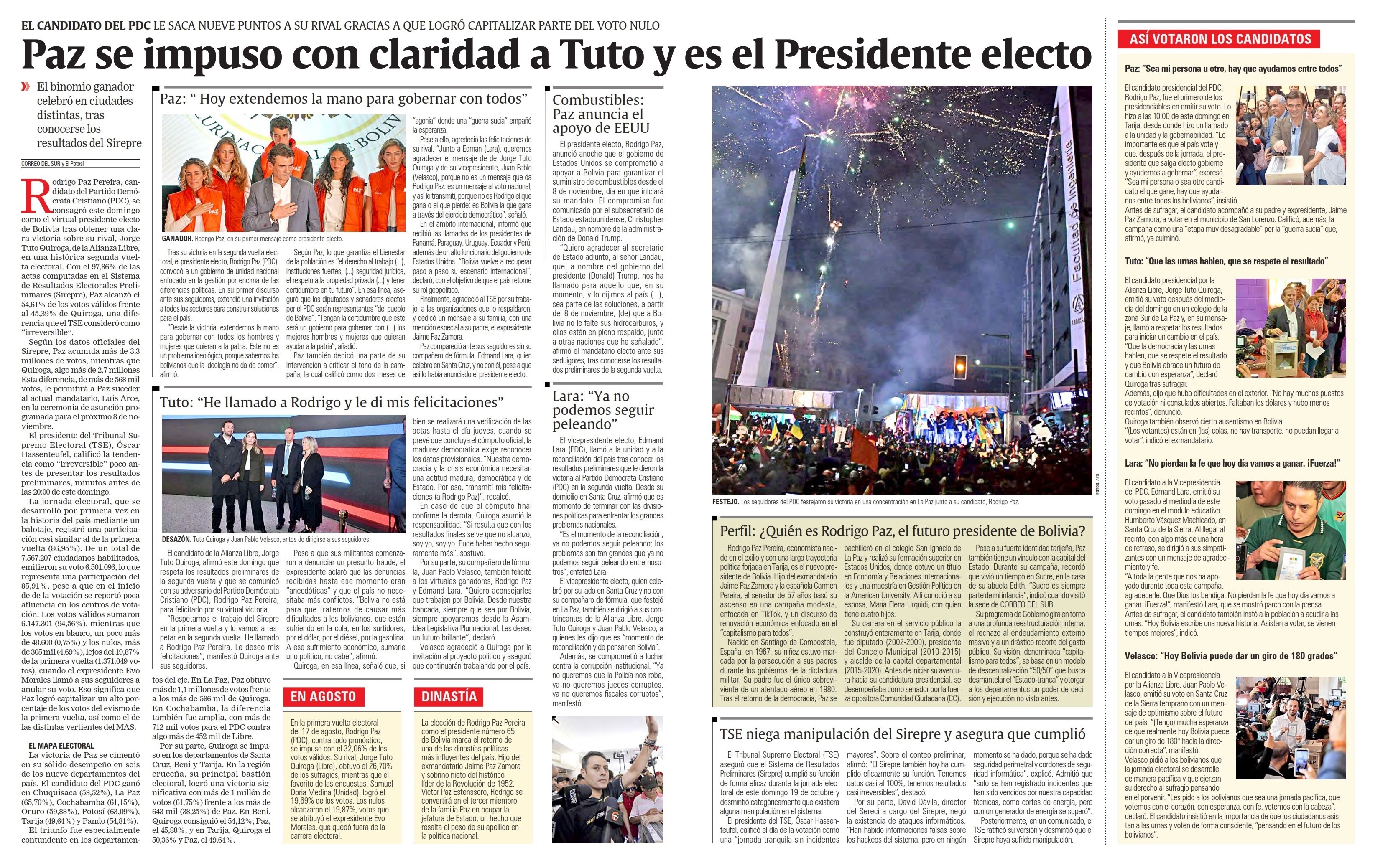 Tuto Quiroga, de la Alianza Libre, en una histórica segunda vuelta electoral. Con el 97"' de las
