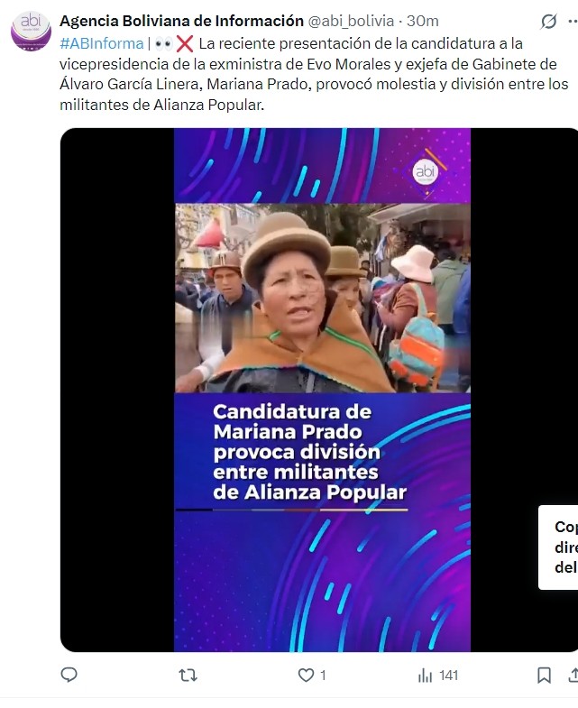La reciente presentación de la candidatura a la vicepresidencia de la exministra de Evo Morales y exjefa de Gabinete de Álvaro García Linera, Mariana Prado, provocó molestia y división entre los militantes de Alianza Popular.