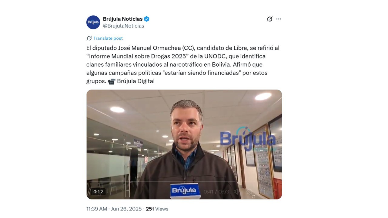 El diputado José Manuel Ormachea (CC), candidato de Libre, se refirió al “Informe Mundial sobre Drogas 2025” de la UNODC, que identifica clanes familiares vinculados al narcotráfico en Bolivia.