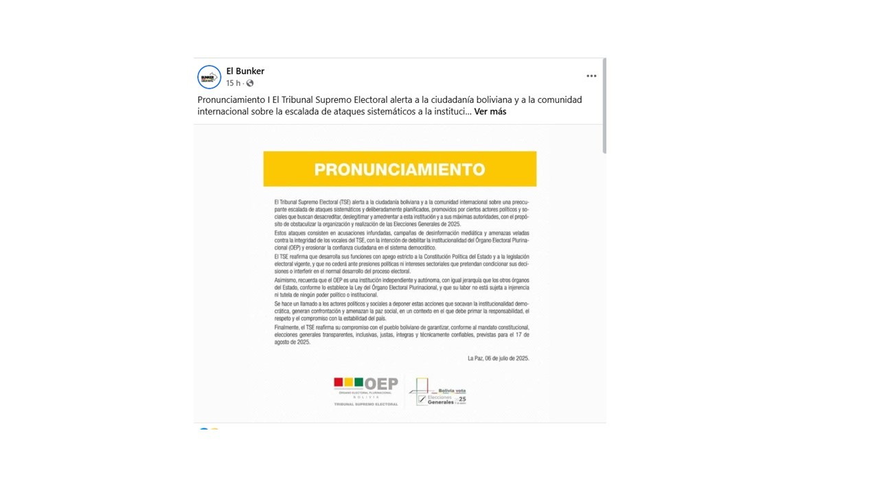 Pronunciamiento I El Tribunal Supremo Electoral alerta a la ciudadanía boliviana y a la comunidad internacional sobre la escalada de ataques sistemáticos