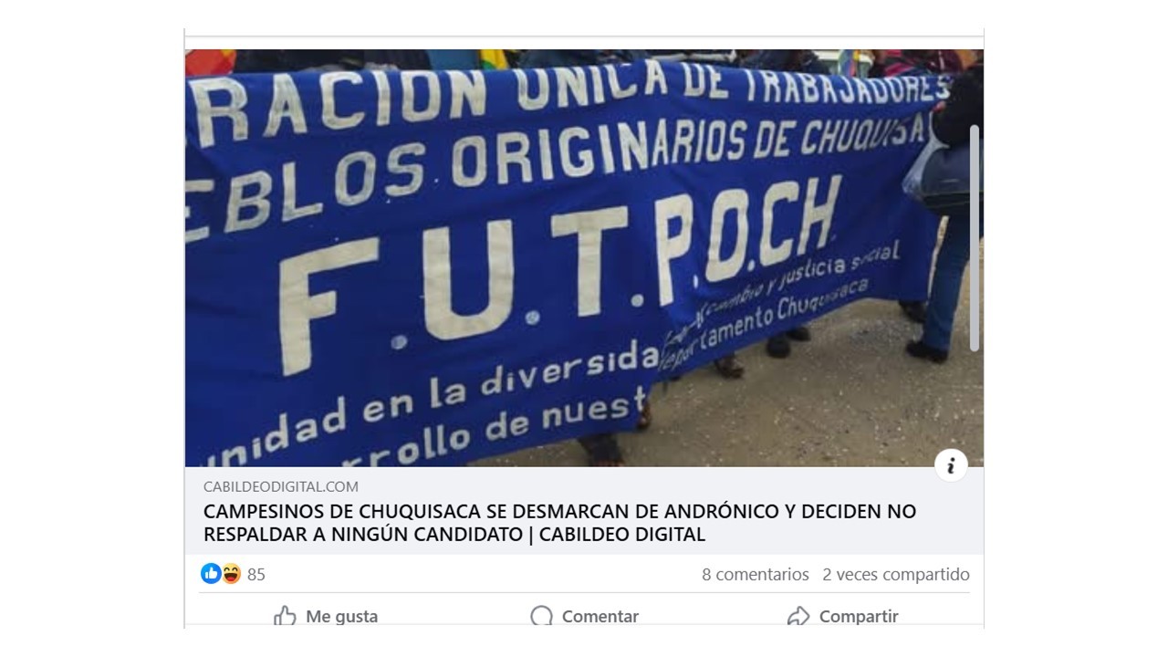 CAMPESINOS DE CHUQUISACA SE DESMARCAN DE ANDRÓNICO Y DECIDEN NO RESPALDAR A NINGÚN CANDIDATO