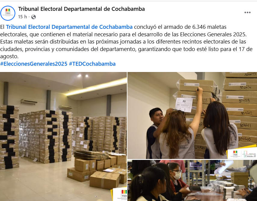 El Tribunal Electoral Departamental de Cochabamba concluyó el armado de 6.346 maletas electorales