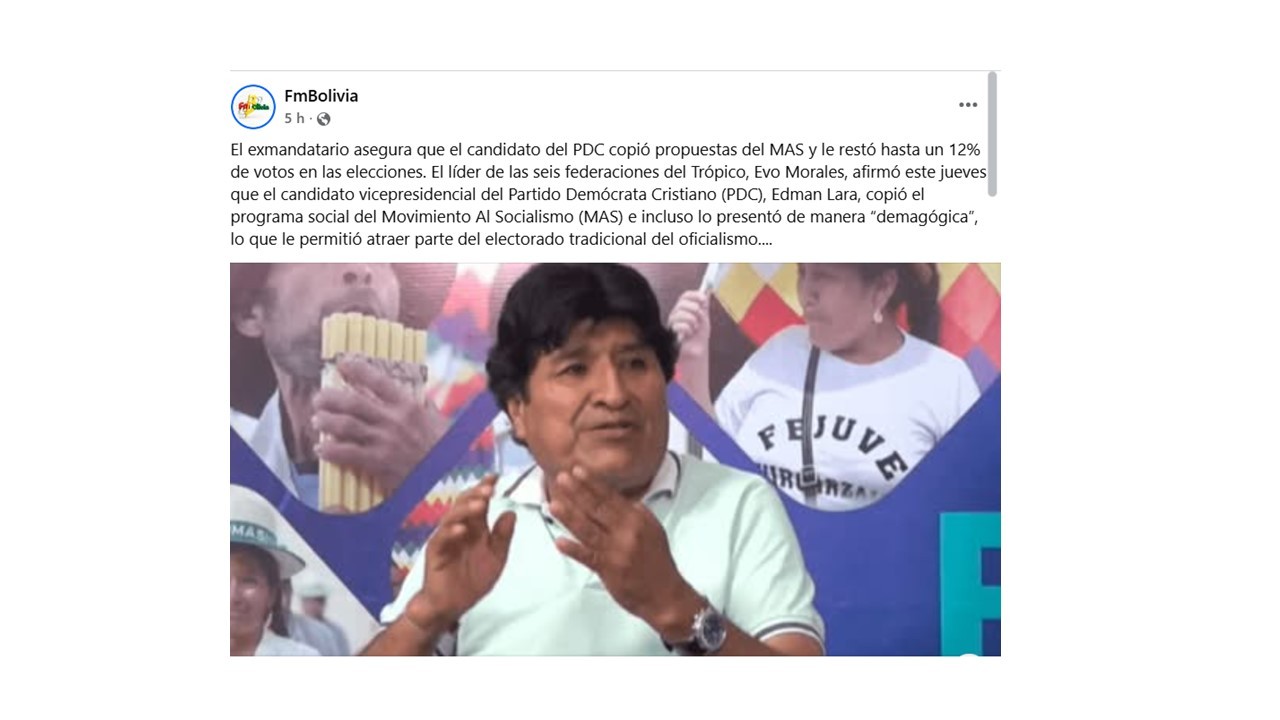 El exmandatario asegura que el candidato del PDC copió propuestas del MAS y le restó hasta un 12% de votos en las elecciones