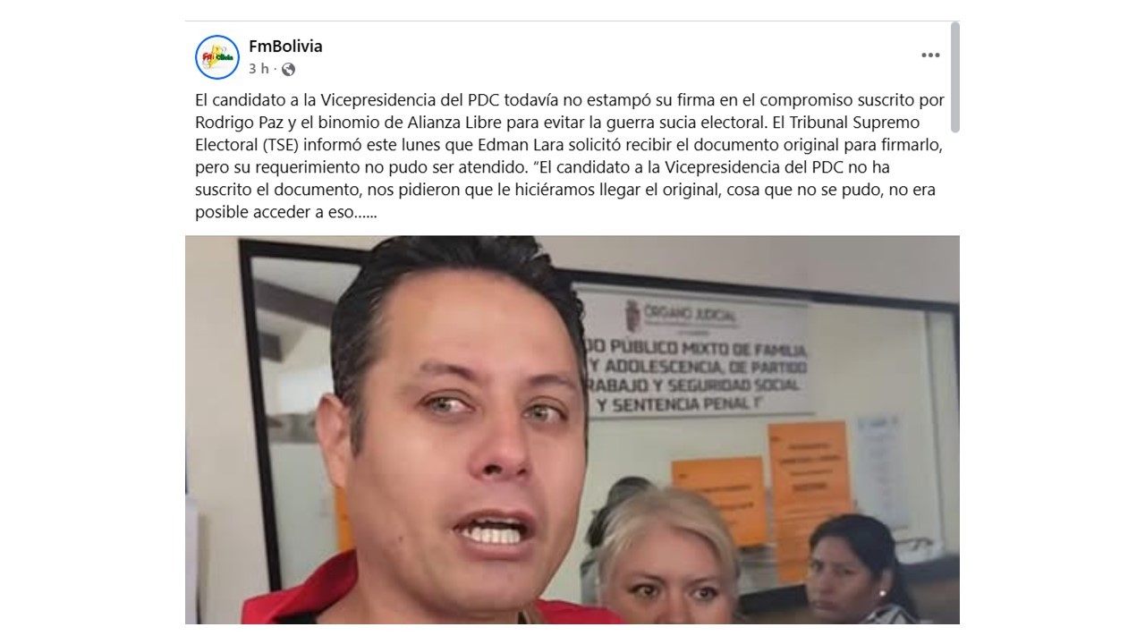 El candidato a la Vicepresidencia del PDC todavía no estampó su firma en el compromiso suscrito por Rodrigo Paz y el binomio de Alianza Libre para evitar la guerra sucia electoral