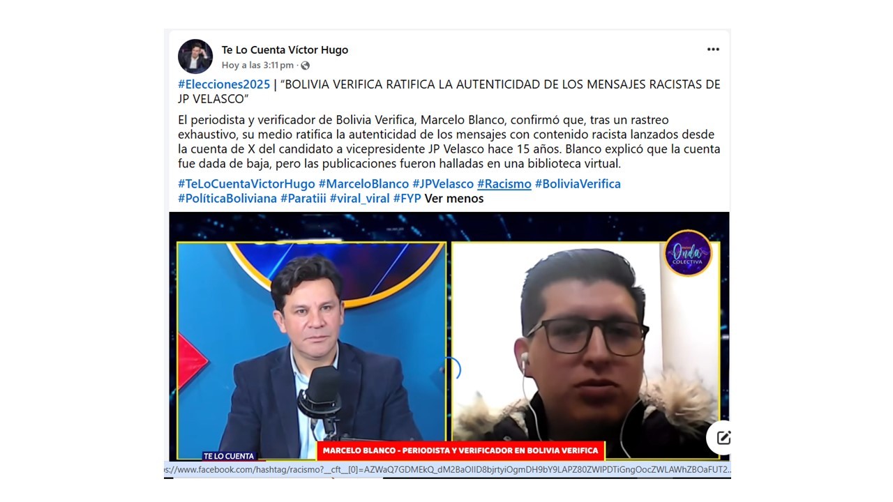 “BOLIVIA VERIFICA RATIFICA LA AUTENTICIDAD DE LOS MENSAJES RACISTAS DE JP VELASCO”