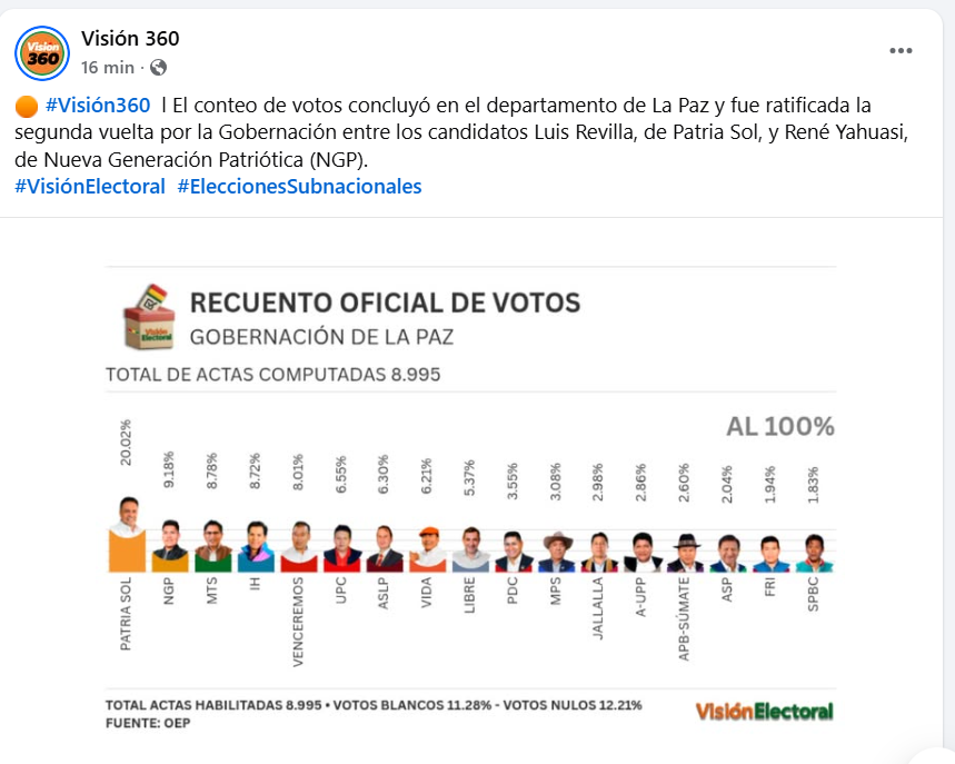 El conteo de votos concluyó en el departamento de La Paz y fue ratificada la segunda vuelta por la Gobernación entre los candidatos Luis Revilla, de Patria Sol, y René Yahuasi, de Nueva Generación Patriótica (NGP).