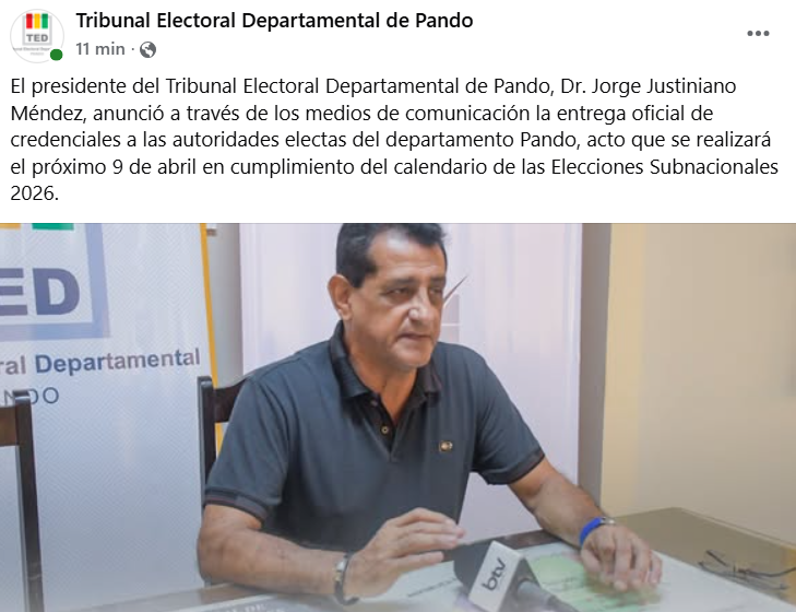 El presidente del Tribunal Electoral Departamental (TED) de Pando, Jorge Justiniano Méndez, anunció en entrevista sobre la entrega oficial de credenciales a las autoridades electas del departamento Pando